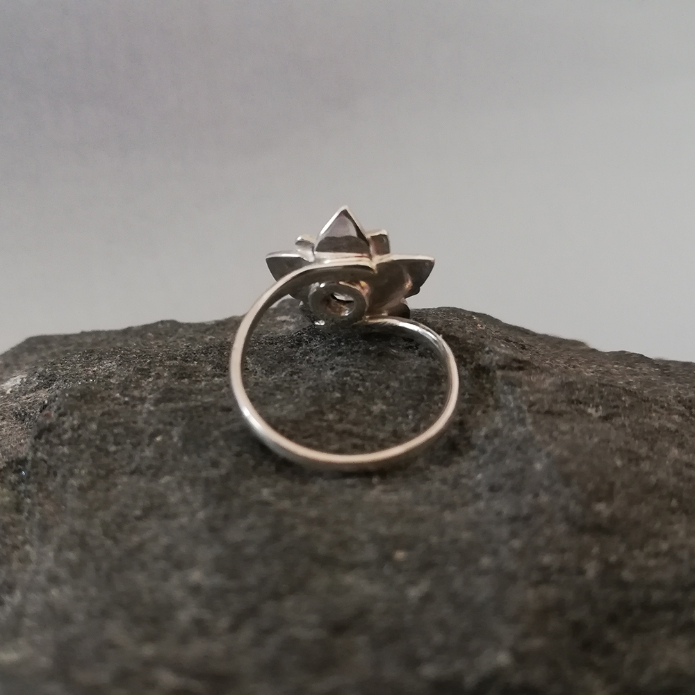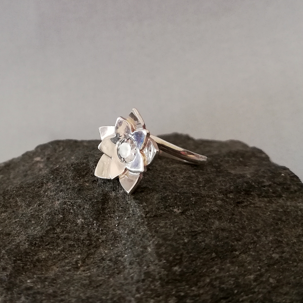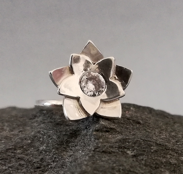 Ein Ring in Blumenform aus 925er Silber mit einem weißen Zirkoniastein in der Mitte der Blüte.