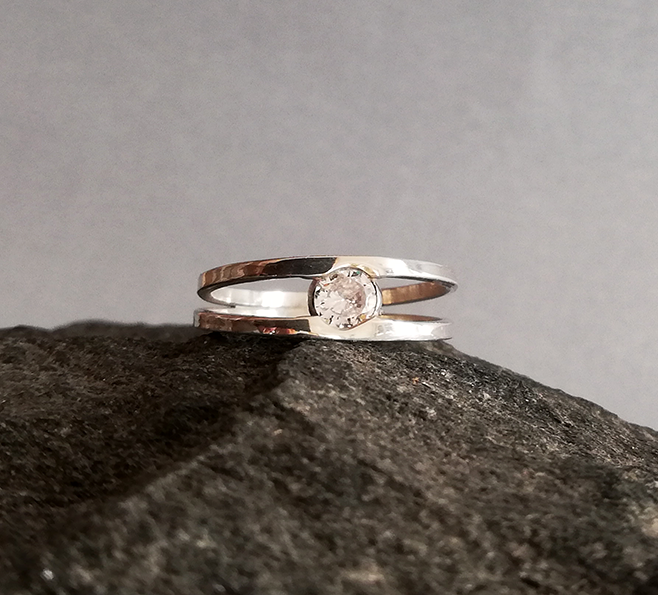 Eine Silberfassung mit modernem Design und einem kleinen weißen Zirkoniastein.